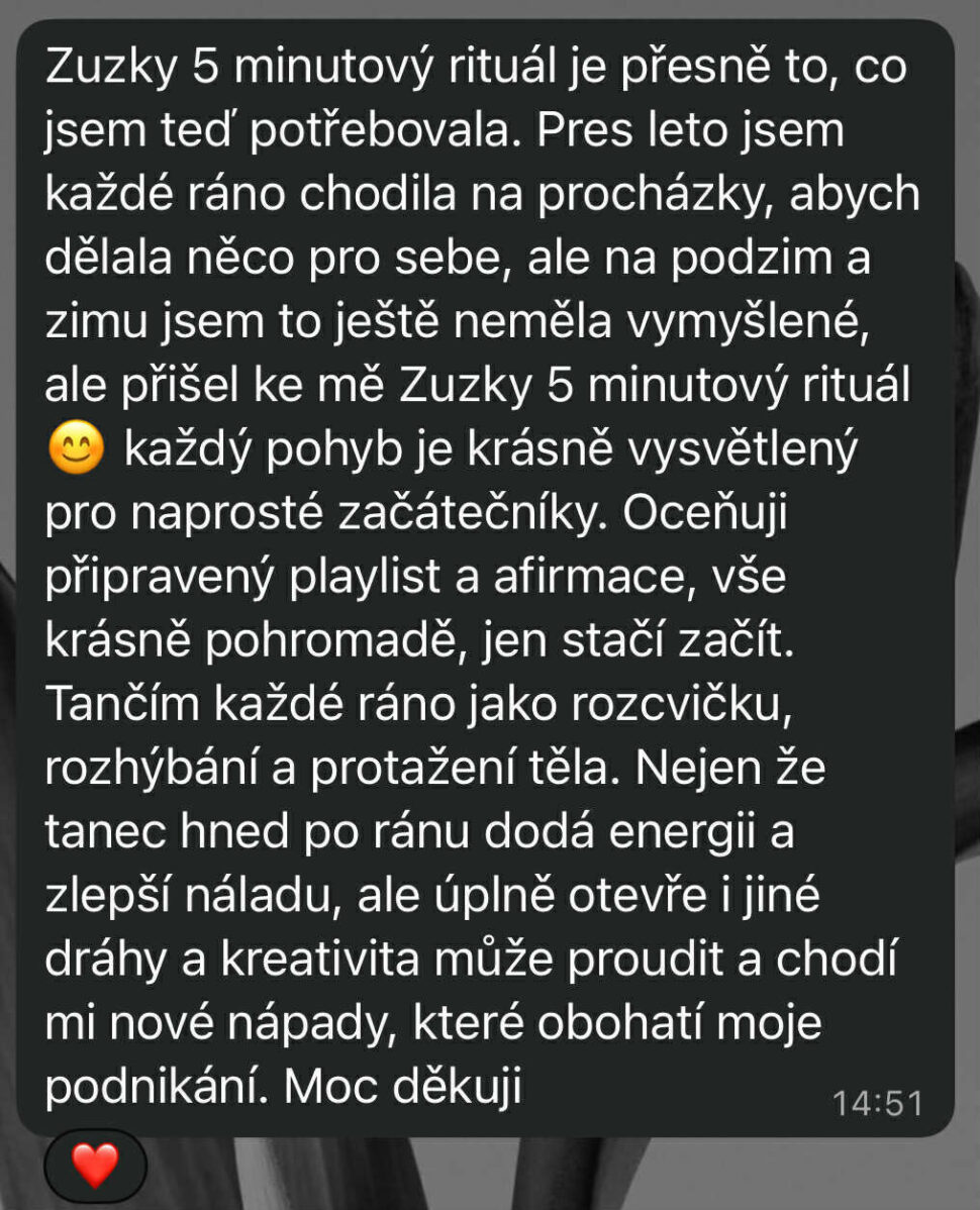 Zuzky 5 minutový rituál je přesně to, co jsem teď potřebovala. Přes léto jsem každé ráno chodila na procházky, abych dělala něco pro sebe, ale na podzim a zimu jsem to ještě neměla vymyšlené, ale přišel ke mně Zuzky 5 minutový rituál 😊 Každý pohyb je krásně vysvětlený pro naprosté začátečníky. Oceňuji připravený playlist a afirmace, vše krásně pohromadě, jen stačí začít. Tančím každé ráno jako rozcvičku, rozhýbání a protažení těla. Nejen že tanec hned po ránu dodá energii a zlepší náladu, ale úplně otevře i jiné dráhy a kreativita může proudit a chodí mi nové nápady, které obohatí moje podnikání. Moc děkuji.